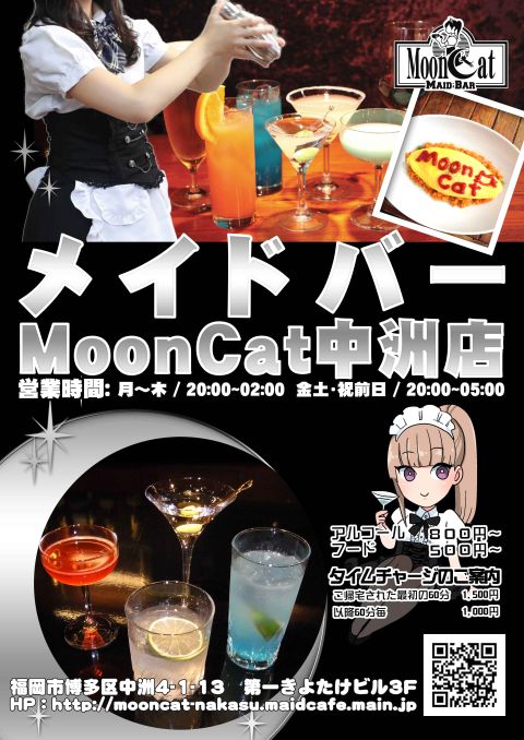 営業時間 営業時間 平日 月〜木 20:00〜深夜2:00 フード・ドリンク・カラオケ ラストオーダー/1:30 週末・金土・祝前日 20:00〜深夜5:00 フード・ドリンク・カラオケ ラストオーダー/4:30 定休日 日曜日 ※その他の臨時店休日は、twitter・HPにてご案内しております。 システム MoonCat中洲店はタイムチャージ制です。 *ご主人様 ・最初の60分  900円 ・以降30分毎  600円 *お嬢様  チャージ料無料 ・お一人様につき最初にワンオーダーをいただいております。 ご注文をお伺いしてからの時間制となります。 ・18歳未満の方は、22時以降のご来店は出来ません。 ・運転者の方は、飲酒をご遠慮いただいております。