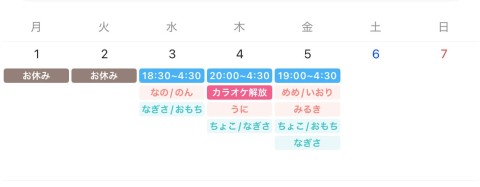 | 営業時間 | 月〜木18:00~23:30 金18:00~5:00 土17:00~5:00 日17:00~23:30 | ||||||||||||||