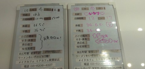 | 営業時間 | ●ミアカフェ東京店(メイドカフェ)http://www.mia-cafe.com/ ● □平日 月~金 17:00~22:00 □土曜・日曜・祝日 12:00~22:00 ★定休日 なし(2019年1月より定休日廃止) □ラストオーダー 閉店の60分前 22:00閉店の場合→21:00ラストオーダー 営業日や出勤状況についてはこちら。 http://pandaland.cutegirl.jp/mif/c_cms_csv/sch_top.php ●ミアリラ&フォト東京店(撮影会&リフレ)http://www.mif-lr.com/ ● □全日 12:00〜22:00 ですがリラクゼーション出勤スタッフがいる時間帯のみ営業です。 ★定休日は不定休(出勤スタッフがいる時間帯の営業) □最終受付 閉店の45分前 22:00閉店の場合→21:15(21:50迄に施術時間が終わるコース) ※高校生不可 ●深夜営業については、公式サイト右上の http://market.chu.jp/schedule1/sche37.cgi ミアグループ総合スケジュール(PC・スマホ) http://market.chu.jp/schedule1/sche37.cgi?dm=1 ミアグループ総合スケジュール(ガラ携帯) をご覧ください。告知日のみ営業となります。告知日以外は深夜営業いたしておりません。 深夜営業対象日 22:00〜翌朝5:00(L.O.4:00) | ||||||||||||||