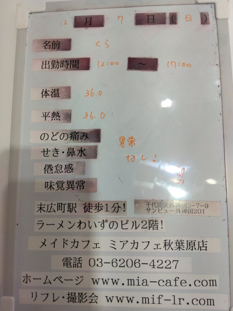 | 営業時間 | ●ミアカフェ東京店(メイドカフェ)http://www.mia-cafe.com/ ● □平日 月~金 17:00~22:00 □土曜・日曜・祝日 12:00~22:00 ★定休日 なし(2019年1月より定休日廃止) □ラストオーダー 閉店の60分前 22:00閉店の場合→21:00ラストオーダー 営業日や出勤状況についてはこちら。 http://pandaland.cutegirl.jp/mif/c_cms_csv/sch_top.php ●ミアリラ&フォト東京店(撮影会&リフレ)http://www.mif-lr.com/ ● □全日 12:00〜22:00 ですがリラクゼーション出勤スタッフがいる時間帯のみ営業です。 ★定休日は不定休(出勤スタッフがいる時間帯の営業) □最終受付 閉店の45分前 22:00閉店の場合→21:15(21:50迄に施術時間が終わるコース) ※高校生不可 ●深夜営業については、公式サイト右上の http://market.chu.jp/schedule1/sche37.cgi ミアグループ総合スケジュール(PC・スマホ) http://market.chu.jp/schedule1/sche37.cgi?dm=1 ミアグループ総合スケジュール(ガラ携帯) をご覧ください。告知日のみ営業となります。告知日以外は深夜営業いたしておりません。 深夜営業対象日 22:00〜翌朝5:00(L.O.4:00) | ||||||||||||||