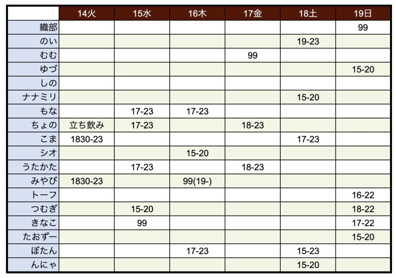 営業時間 | 18:00〜 | ||||||||||||||