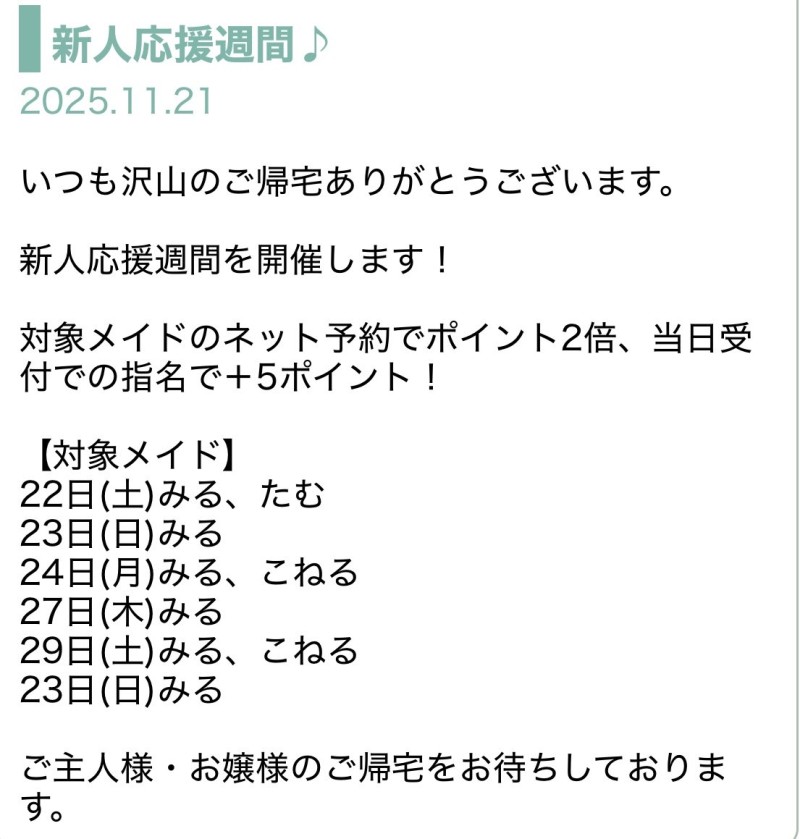 対象メイドへのネット予約でポイント2倍です✨ぜひこの機会に改めてご挨拶出来れば嬉しいです👸🏻🎀
