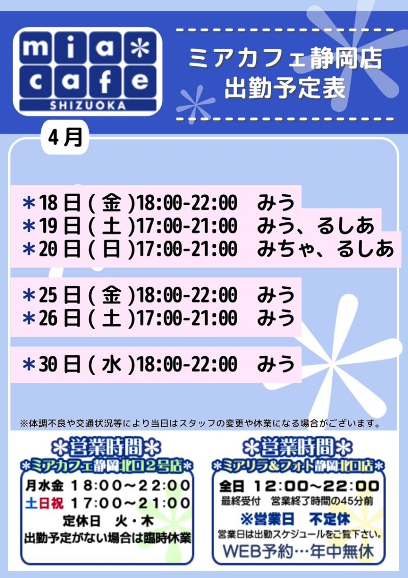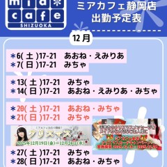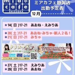 | 営業時間 | 静岡店は出勤スタッフがいれば営業です! 基本的に 12時~22時が営業時間です! ●静岡店のツイッター @shizuokamaidsan https://twitter.com/shizuokamaidsan ●ミア静岡店の営業曜日&営業時間● ☆月〜木 14:00〜22:00(最終受付20:00) ☆金曜日 12:00〜22:00(最終受付21:00) ☆土・日・祝 12:00〜22:00(最終受付21:00) 営業時間外はオンライン予約にてお願いいたします。 PC・携帯共通 → http://m-kanzume.moo.jp/yoyaku2/user.cgi ●ミアガイド出勤状況● スマホ・PC → 後日公開予定 ★静岡店スタッフによるミア甲府店でのメイドカフェリアル営業★ ☆不定期 サイトにてご確認ください。 http://market.chu.jp/schedule1/sche37.cgi | ||||||||||||||