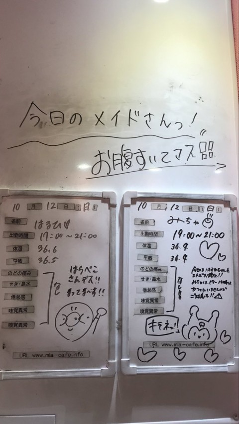 | 営業時間 | 静岡店は出勤スタッフがいれば営業です! 基本的に 12時~22時が営業時間です! ●静岡店のツイッター @shizuokamaidsan https://twitter.com/shizuokamaidsan ●ミア静岡店の営業曜日&営業時間● ☆月〜木 14:00〜22:00(最終受付20:00) ☆金曜日 12:00〜22:00(最終受付21:00) ☆土・日・祝 12:00〜22:00(最終受付21:00) 営業時間外はオンライン予約にてお願いいたします。 PC・携帯共通 → http://m-kanzume.moo.jp/yoyaku2/user.cgi ●ミアガイド出勤状況● スマホ・PC → 後日公開予定 ★静岡店スタッフによるミア甲府店でのメイドカフェリアル営業★ ☆不定期 サイトにてご確認ください。 http://market.chu.jp/schedule1/sche37.cgi | ||||||||||||||