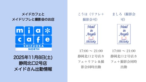 | 営業時間 | 静岡店は出勤スタッフがいれば営業です! 基本的に 12時~22時が営業時間です! ●静岡店のツイッター @shizuokamaidsan https://twitter.com/shizuokamaidsan ●ミア静岡店の営業曜日&営業時間● ☆月〜木 14:00〜22:00(最終受付20:00) ☆金曜日 12:00〜22:00(最終受付21:00) ☆土・日・祝 12:00〜22:00(最終受付21:00) 営業時間外はオンライン予約にてお願いいたします。 PC・携帯共通 → http://m-kanzume.moo.jp/yoyaku2/user.cgi ●ミアガイド出勤状況● スマホ・PC → 後日公開予定 ★静岡店スタッフによるミア甲府店でのメイドカフェリアル営業★ ☆不定期 サイトにてご確認ください。 http://market.chu.jp/schedule1/sche37.cgi | ||||||||||||||